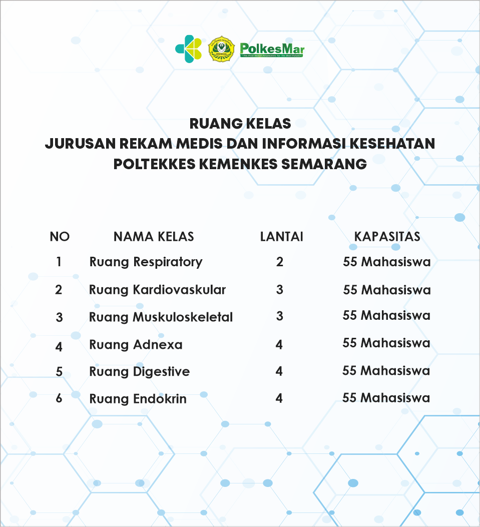 Ruang kelas di Jurusan RMIK yang digunakan untuk kegiatan PBM terdiri dari ruang kelas teori maupun ruang kelas praktik. Ruang kelas Jurusan RMIK berada di lantai 2, 3, dan lantai 4.