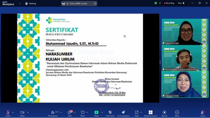 Semarang – Kamis, 20 Maret 2025, Jurusan Rekam Medis dan Informasi Kesehatan (RMIK) Poltekkes Kemenkes Semarang menyelenggarakan kuliah umum dengan tema: “Keamanan dan Optimalisasi Sistem Informasi dalam Rekam Medis Elektronik untuk Efisiensi Pembiayaan Kesehatan”. Kegiatan yang berlangsung secara virtual melalui platform Zoom Meeting, sehingga memungkinkan partisipasi mahasiswa dan dosen dari berbagai lokasi tanpa mengurangi antusiasme dan interaktivitas selama sesi berlangsung.