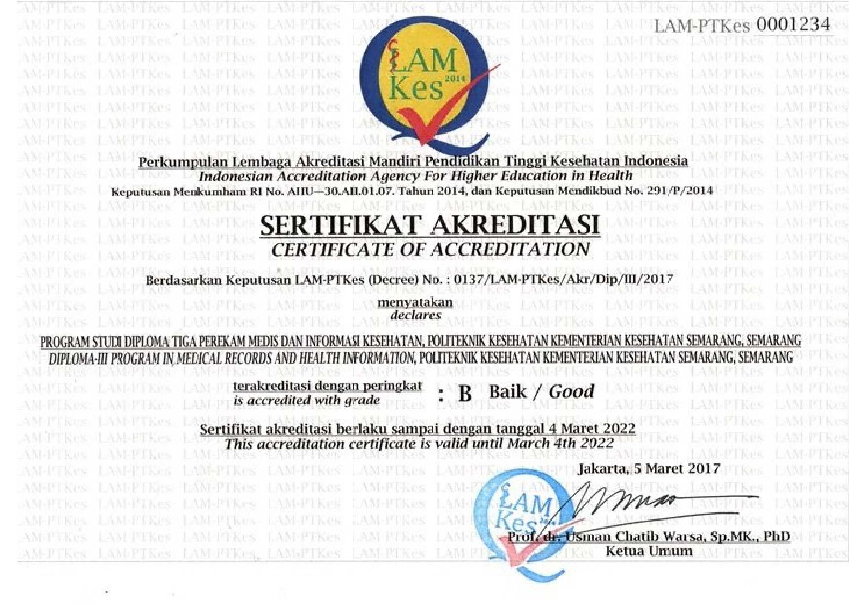 Semarang – Program Studi Rekam Medis dan Informasi Kesehatan Program Diploma Tiga Poltekkes Kemenkes Semarang mampu meraih “Akreditasi Unggul” dari LAMP-PTKES berdasarkan Surat Keputusan LAMPT-KES Nomor 0538/LAM-PTKES/Akr/Dip/VII/2022. Sertifikat “Akreditasi Unggul” berlaku sejak tanggal 14 Juli 2022 sampai 14 Juli 2027.